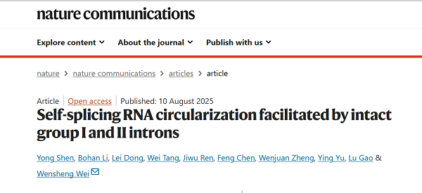 2025 8 10 日,一項在 RNA 治療領(lǐng)域具有里程碑意義的研究成果重磅發(fā)布 ——北京大學(xué) / 昌平實驗室魏文勝教授團隊與圓因生物攜手,在國際知名期刊《Nature Communications》發(fā)表了題為 “Self-splicing RNA circularization facilitated by intact group I and II introns” 的研究論文。該研究提出了兩種全新的體外 RNA 環(huán)化技術(shù),不僅為 RNA 環(huán)化領(lǐng)域帶來了革新,凸顯了圓因生物在環(huán)狀 RNA 平臺搭建方面的卓越實力。