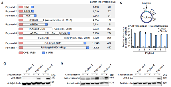 利用CIRC技術(shù),研究團隊成功環(huán)化了編碼全長肌營養(yǎng)不良蛋白(約 12,206 個核苷酸)的 RNA,并實現(xiàn)了 427 KDa 蛋白的完整表達(dá)。這一重大突破,徹底打破了環(huán)化 RNA 編碼蛋白大小的限制,為大分子量蛋白缺失相關(guān)疾病的治療開辟了全新路徑。